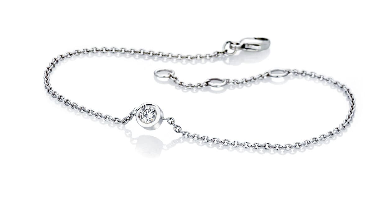 Diamond bezel bracelet. Very popular, a style that is both classic and contemporary. 18 carats gold. Gold weight 2.45 grams. Gold chain with snap hook, measuring 18cm (adjustable on request).