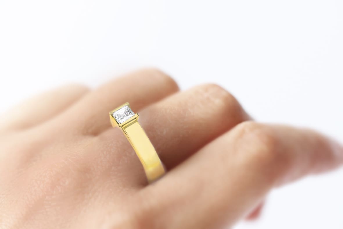 Princess cut diamond engagement ring : a ring characterized by its clean lines, V setting, highlighting the princess cut diamonds in a square or rectangular form. Gold 18 carats weight approx 8 gr. depending on the diamond and finger size. Ring width equal to the princess cut diamond width. This princess cut diamond ring is delivered in its luxury jewellery box. See VIDEO below photos. The engraving "i-diamants" is optional. The certified diamond choice is yours : use the GREEN PRICE SLIDER and find our diamond suggestions and selection.