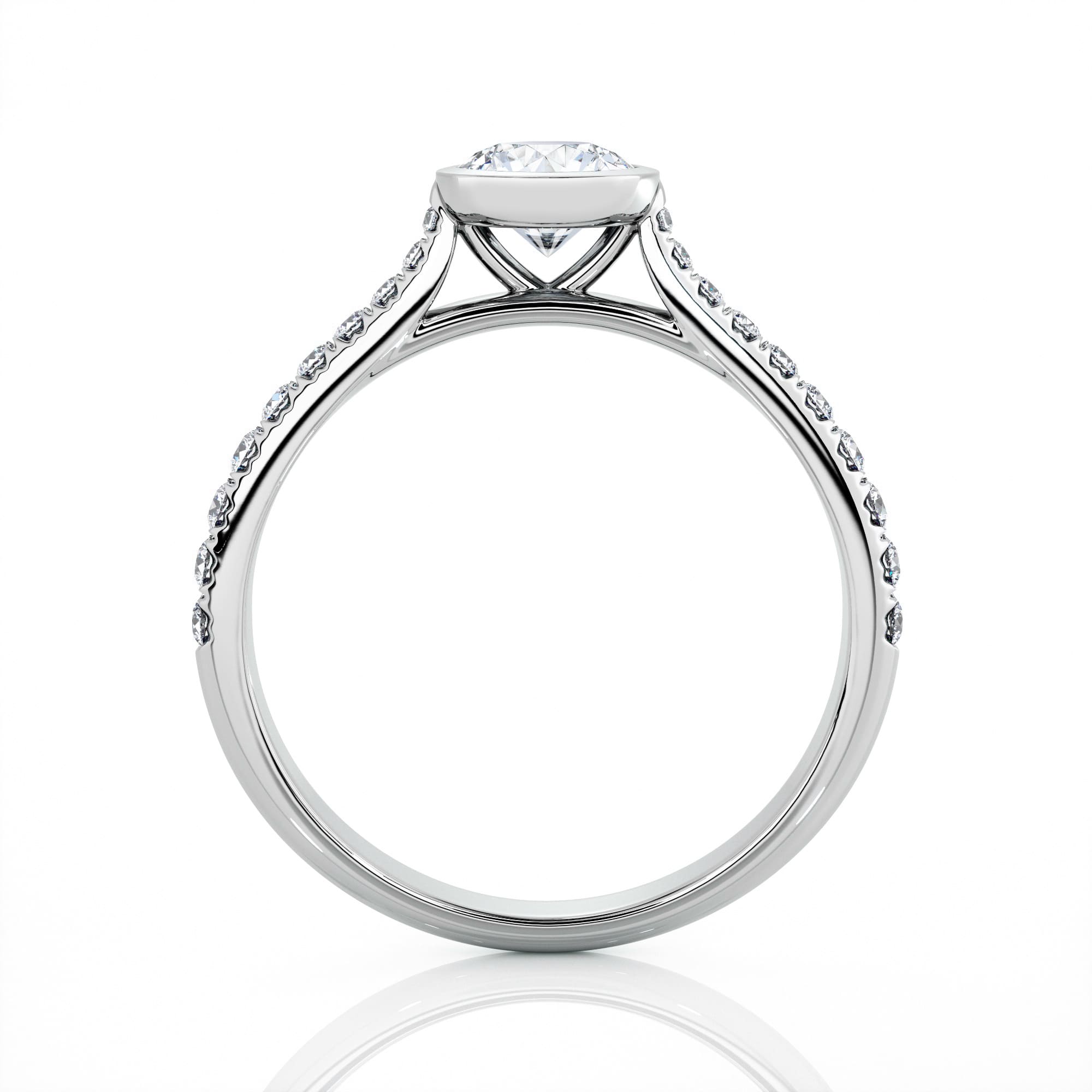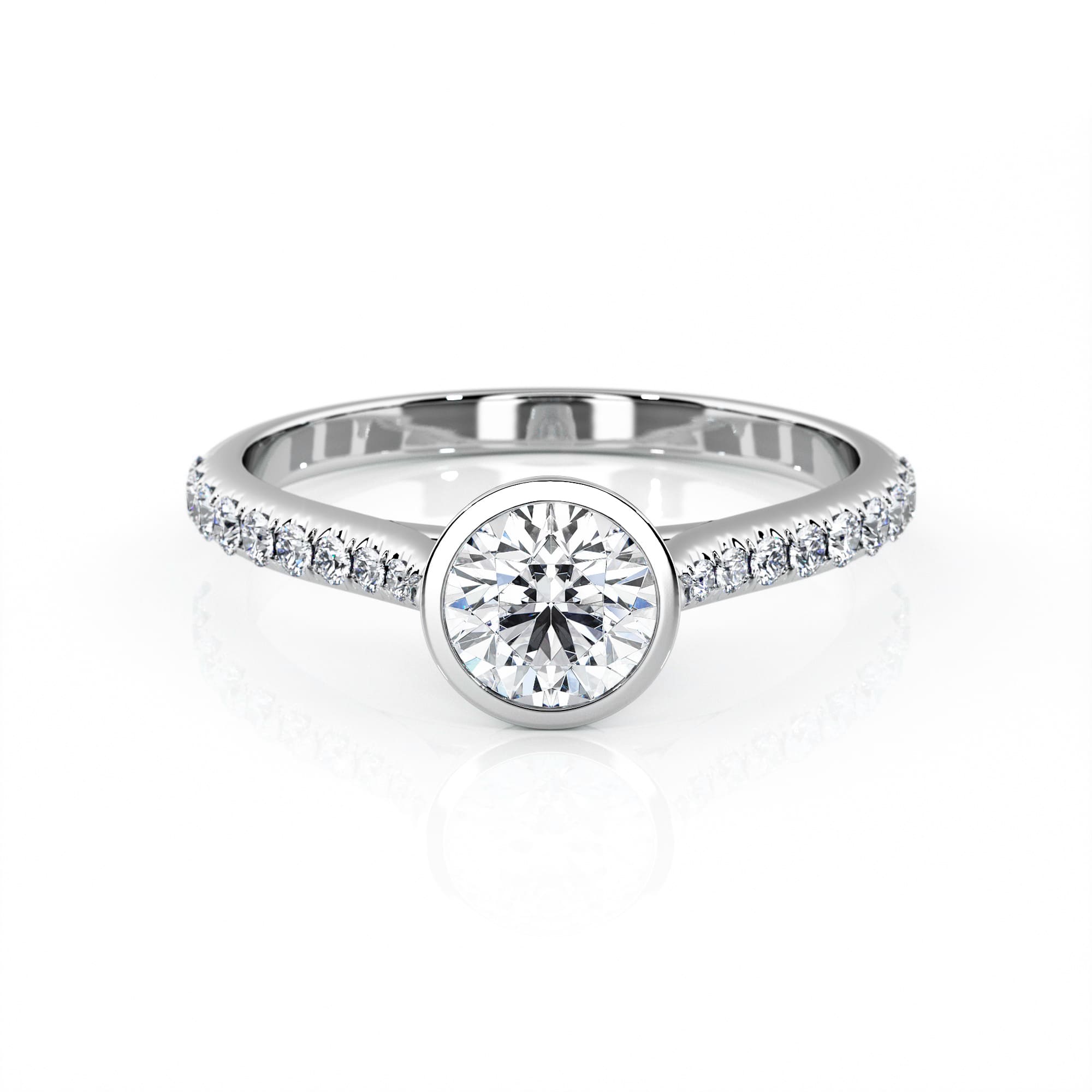Diamond solitaire with bezel. Solitaire available in 18-carat (750/000) white, yellow or pink gold or in 950/000 platinum. Weight of gold: +/- 2 or 3 grams depending on the chosen diamond and the size of the finger. French made. Our jewels are set in France by setters with French know-how to guarantee quality and solidity. Ring set with pavé diamonds on each side of the center diamond and a total weight of +/- 0.20 carat depending on the weight of the center diamond. Paving quality: color F and purity VS. Width of the ring in proportion to the diameter of the diamond chosen and the paving diamonds, for example a ring of 2mm wide for a diamond of 5mm in diameter (0.50 carat).