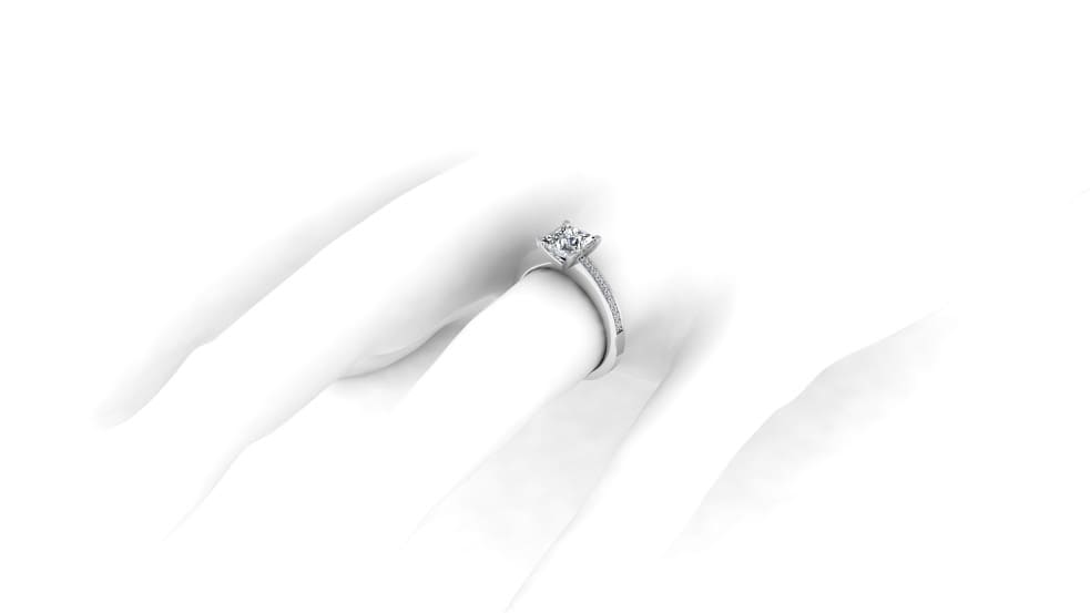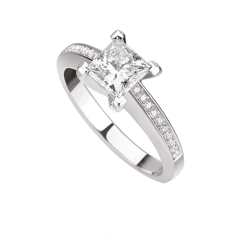Bague avec diamant princesse certifié GIA, IGI ou HRD. Entourage de diamants de 0,20 carat total (pavage de 2 x 10 diamants de chaque côté du diamant taille princesse au centre). Un style plein d’éclat sans être ostentatoire. Pour célébrer l'aube d'une romance passionnée et raffinée. Bague fait main sur mesure selon choix du diamant taille princesse. Fabrication française. Or : 18 carats (750/000). Poids d'or : 3 à 4 grs selon diamant et tour de doigt. Bague diamant princesse livrée avec certificat GIA, IGI ou HRD et avec écrin. Les diamants taille princesse ne sont pas présentés dans le catalogue en ligne, mais sont proposées sur demande spéciale. Voir VIDEO en-dessous des photos. La gravure "i-diamants" est optionnelle. Voir aussi notre Alliance diamant Princesse