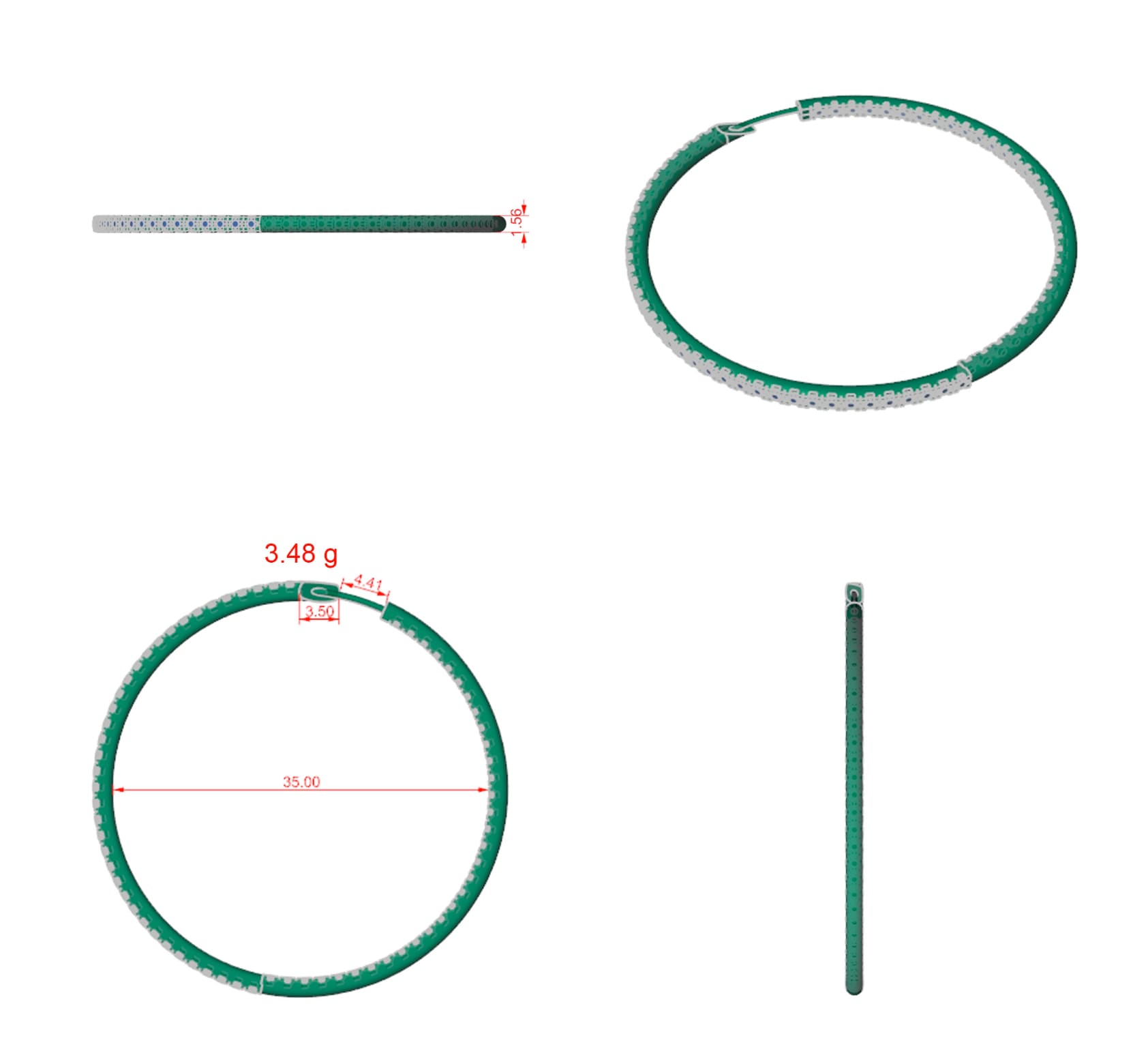 Boucles d'oreilles Créoles serties extérieur & intérieur (*) de diamants, diamètre anneau 3,5 cm . Des boucles d'oreilles Créoles serties de diamants gorgées de lumière : 2 x 69 diamants pour un poids total de 1,4 carats de diamants qualité collection blanc exceptionnel ( E ) et pureté VVS1 "top make". Un style rayonnant. Créoles de Fabrication française. Or 750/00 (anciennement dénomination 18 carat) . Poids d'or: 2 x 3 grs. Fermoirs Alpa. * : Sertissage de diamants e&i : extérieur & intérieur des créoles, visualisé par la photo 2 : blanc = emplacements pour les diamants, vert = or, partie sans diamants. Voir aussi notre version Créoles Collection 1.5 cm de i-diamants.