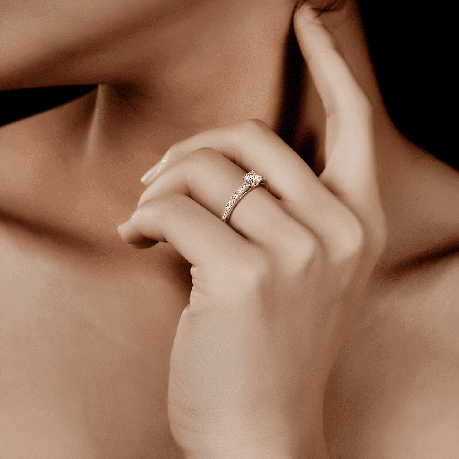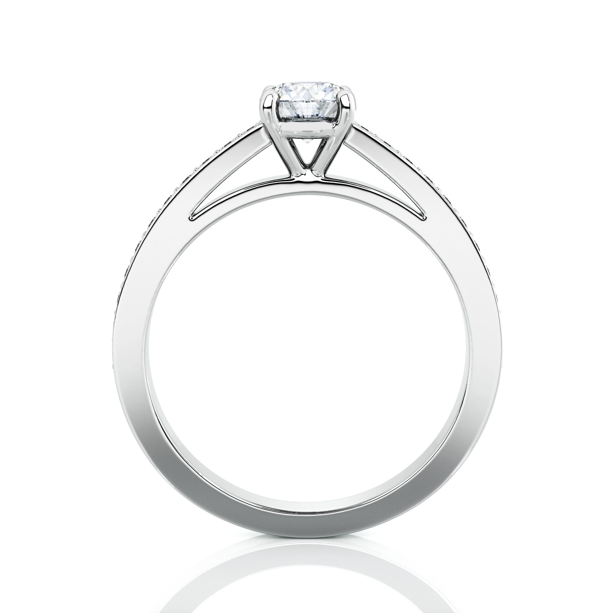 Nos bijoux sont sertis en France par des sertisseurs au savoir-faire français pour en garantir la qualité et la solidité. Anneau serti d'un pavage de diamants de chaque côté du diamant de centre et d'un poids total de +/- 0,20 carat selon le poids du diamant de centre. Qualité du pavage : couleur F et pureté VS. Largeur de l'anneau en proportion du diamètre du diamant choisi et des diamants de pavage, par exemple un anneau de 2mm de large pour un diamant de 5 mm de diamètre (0,50 carat).